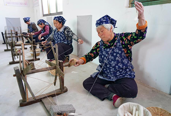 4月15日,河北省迁安市杨店子镇高引铺村“绣娘手艺坊”的工人在运用纺车纺线。为促进当地妇女工作创业,高引铺村2017年9月在省妇联支持下注册成立了村团体控股、全民参股的“绣娘手艺坊”,让村里的妇女根据自己状况挑选来厂里或在家里运用传统办法纺织土布,制造床上用品、围巾、箱包等,产品俏销北京、上海和广州等地,带动全村410个家庭增收。